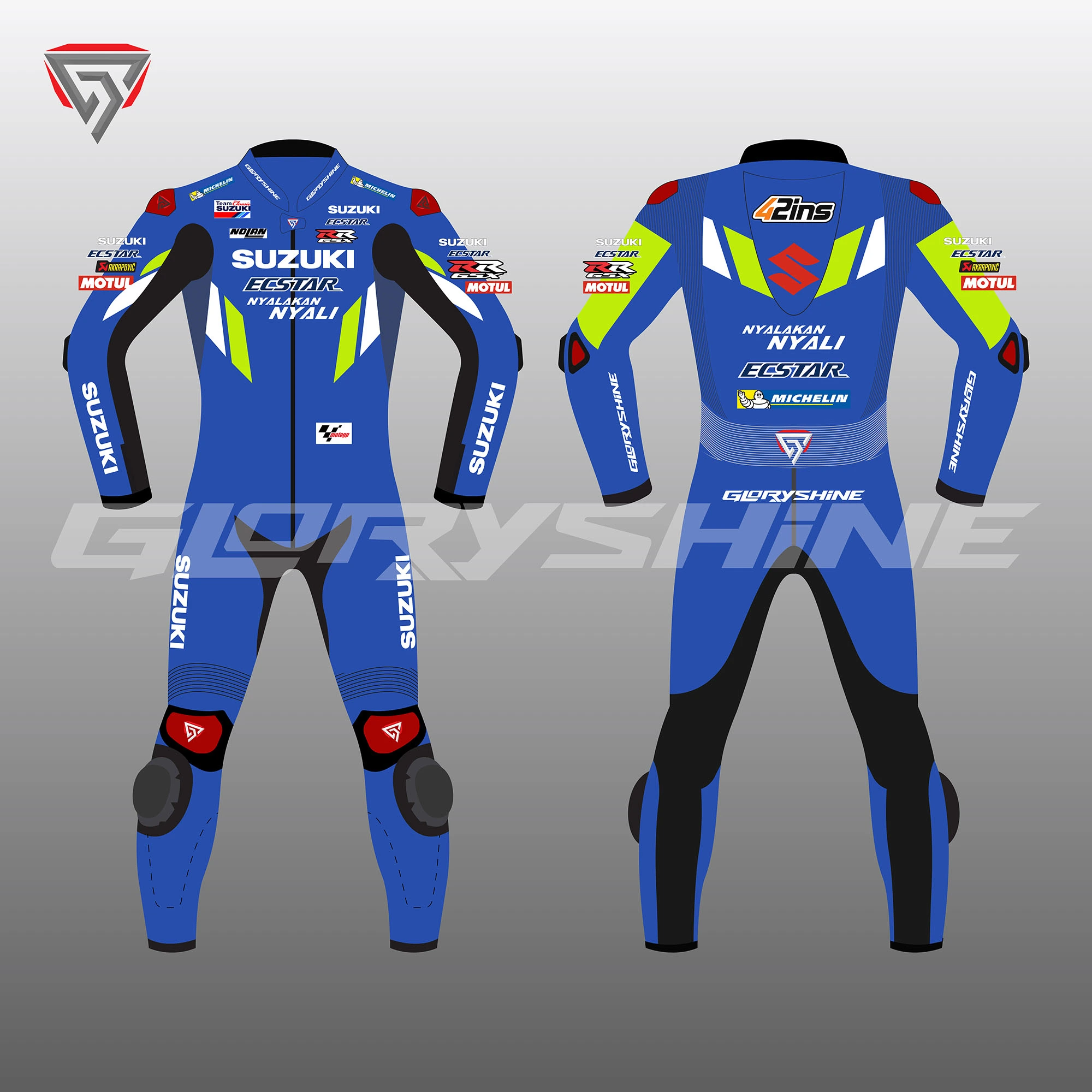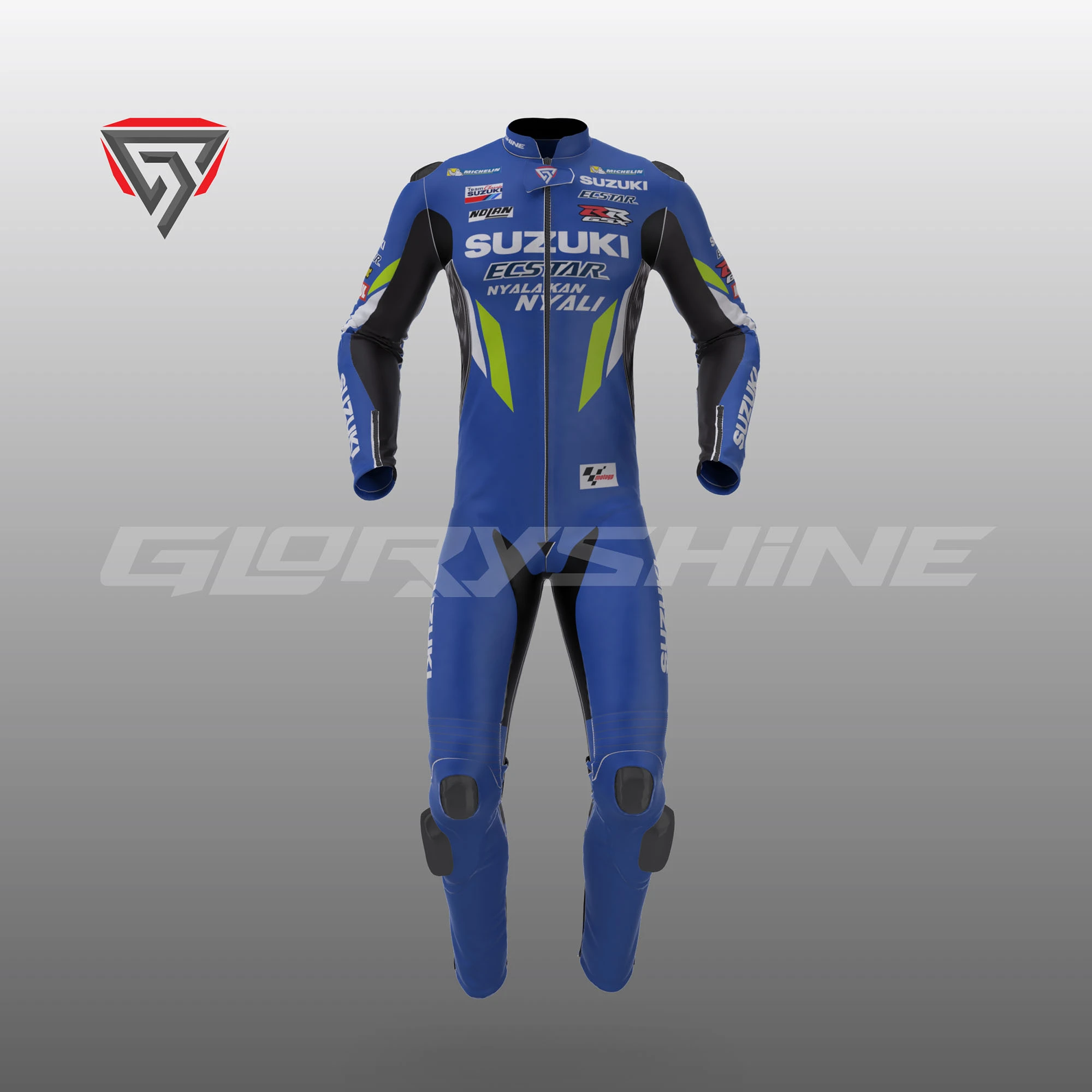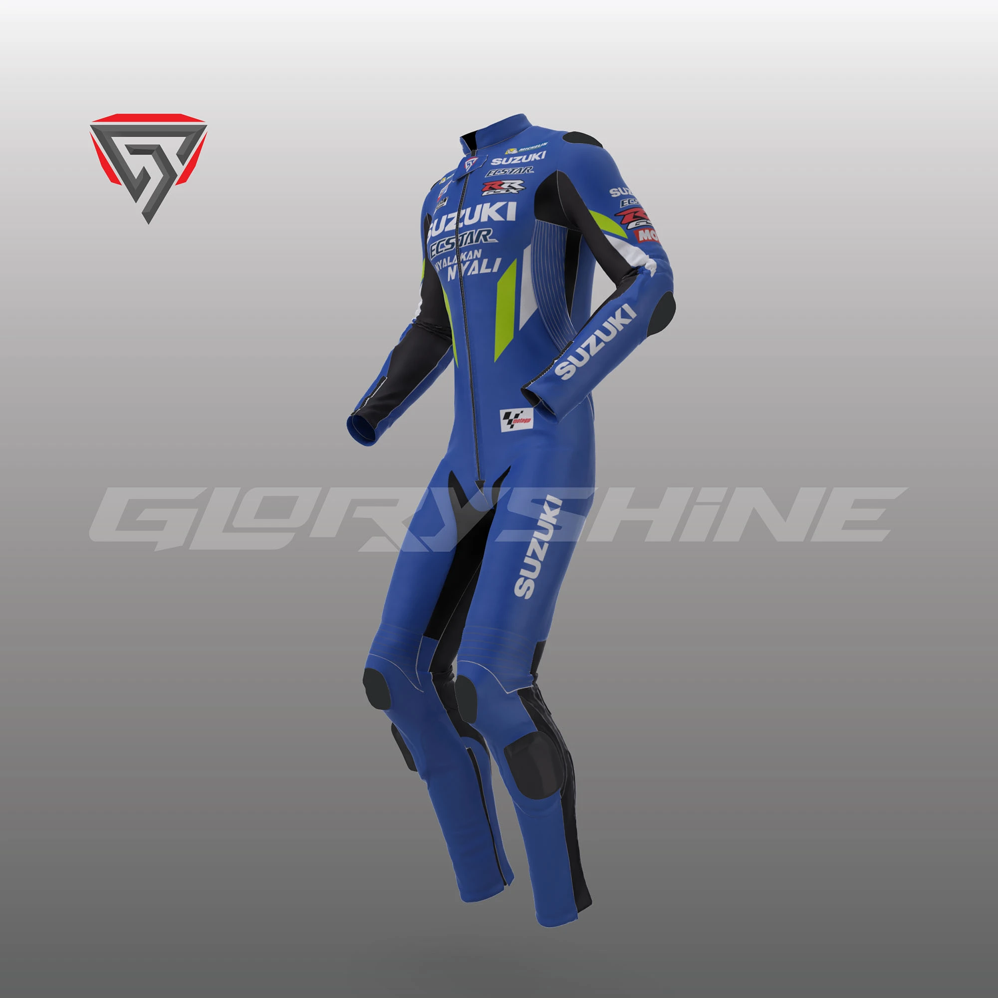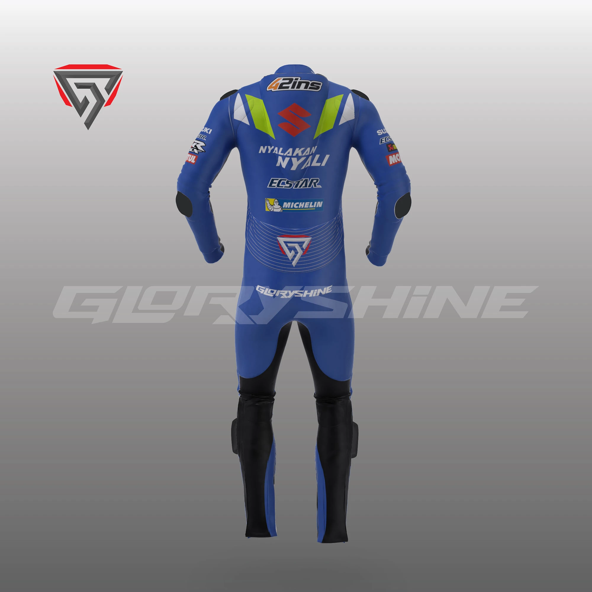 Denna läder kostym designad för professionella motorcyklister för att visa sin kärlek till honom på banan. För fullständig säkerhet och komfort för föraren är dräkten tillverkad av kohudsläder med en tjocklek på 1,2-1,3 mm och Schoeller Kevlar-tyg. Certifierade kolfiberförstärkta externa skydd och PU-interna skydd används i Alex Rins Läderdräkt Team Suzuki ECSTAR MotoGP 2019. Detta skyddar känsliga delar av kroppen (axel, armbåge, ryggrad och knä) helt och hållet. Inuti dräkten finns ett makromeshfoder för komfort, och alla interna skydd är enkelt avtagbara, inklusive den aerodynamiska puckeln.